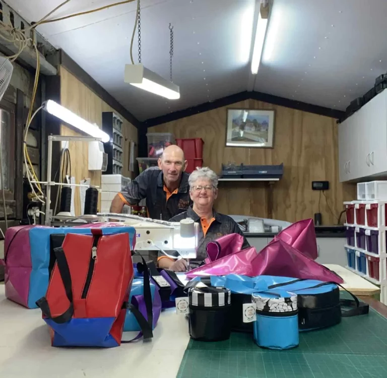 Allyson and Cameron inside the Dust & Iron workspace — where creativity, craftsmanship, and country life come together. Each bag, toilet roll holder, and work accessory is handmade with care, right here in the outback.